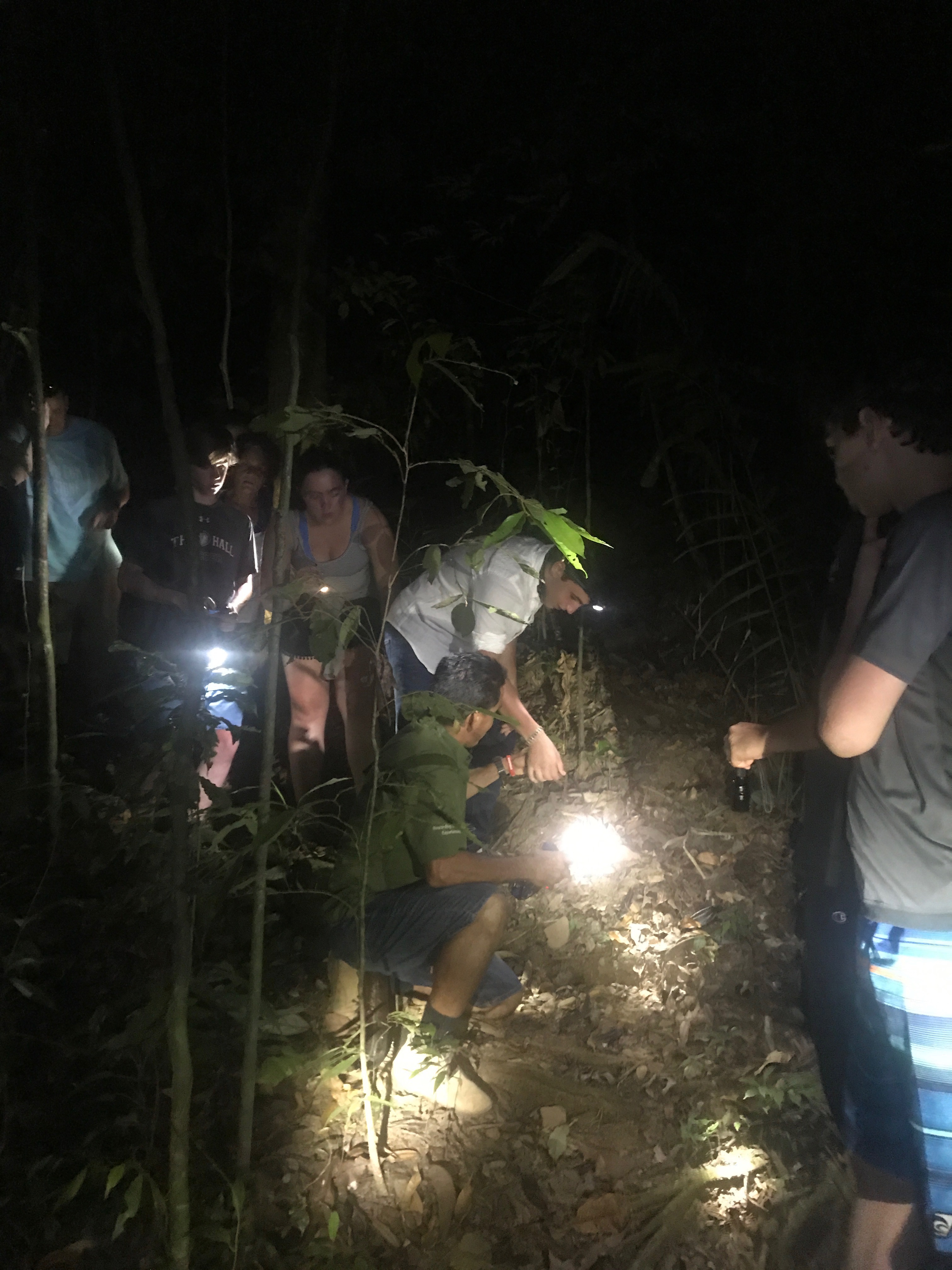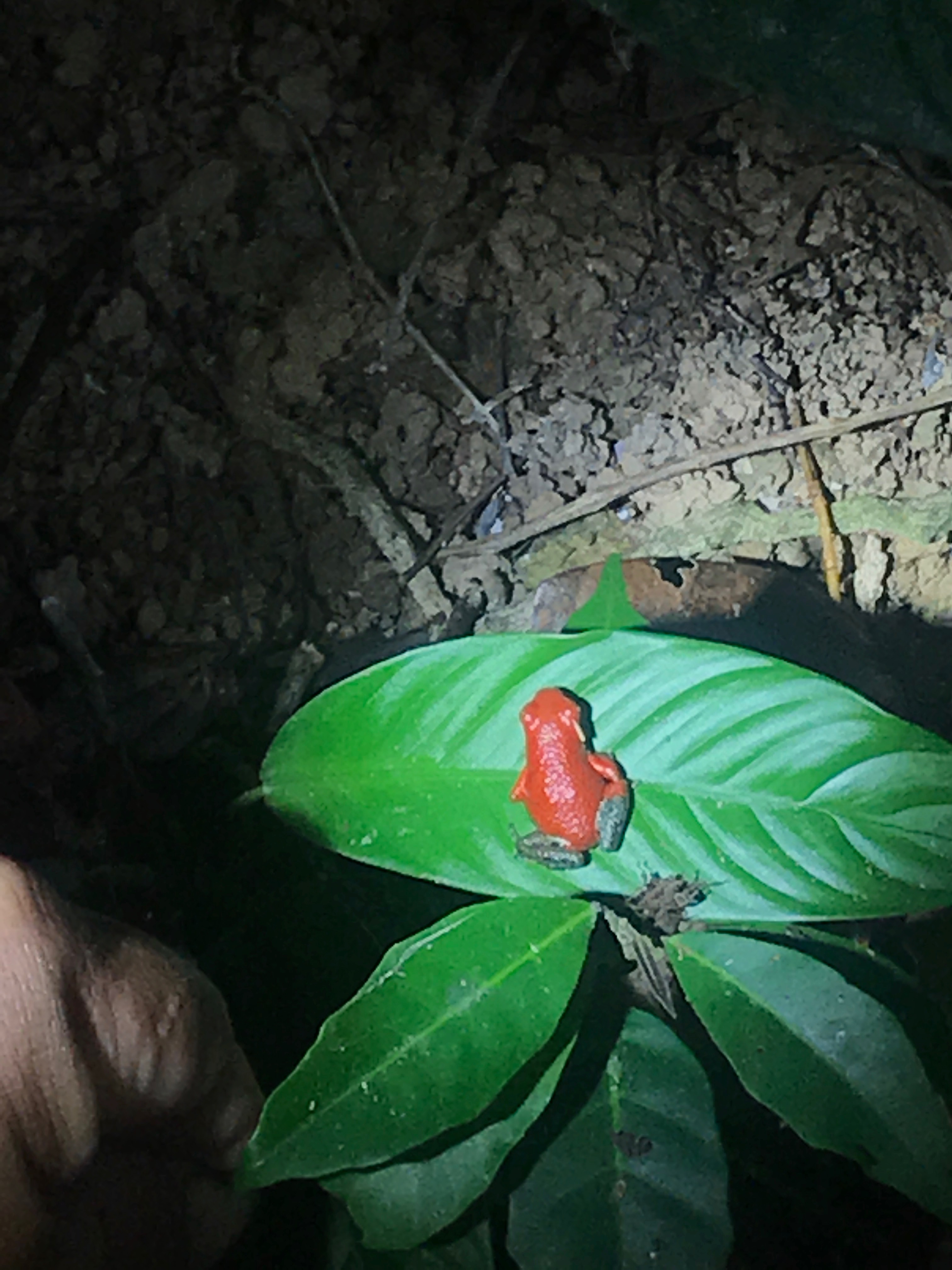 The campsite was really nice when we got there. I was lucky enough to get a private room, which had a really nice view of the jungle. Our tour guides cooked us dinner, which was SO good! I also liked that we used natural light instead of man-made light. The nigh hike was really fun! I loved that we saw poisonous dart frogs and regular frogs, as well as snakes. The snakes were really cool. I got to wrap one around my arm, which I thought was awesome. The only scary part was the amount of spiders that we saw. There were hundreds of daddy long-legs and tarantulas of different sizes. There was this huge one that was orange and black! I think when I saw it, that was the final push over my fear. Speaking of the huge spider, next to it was this really big bull frog. It was massive! I never had seen a frog so big before!