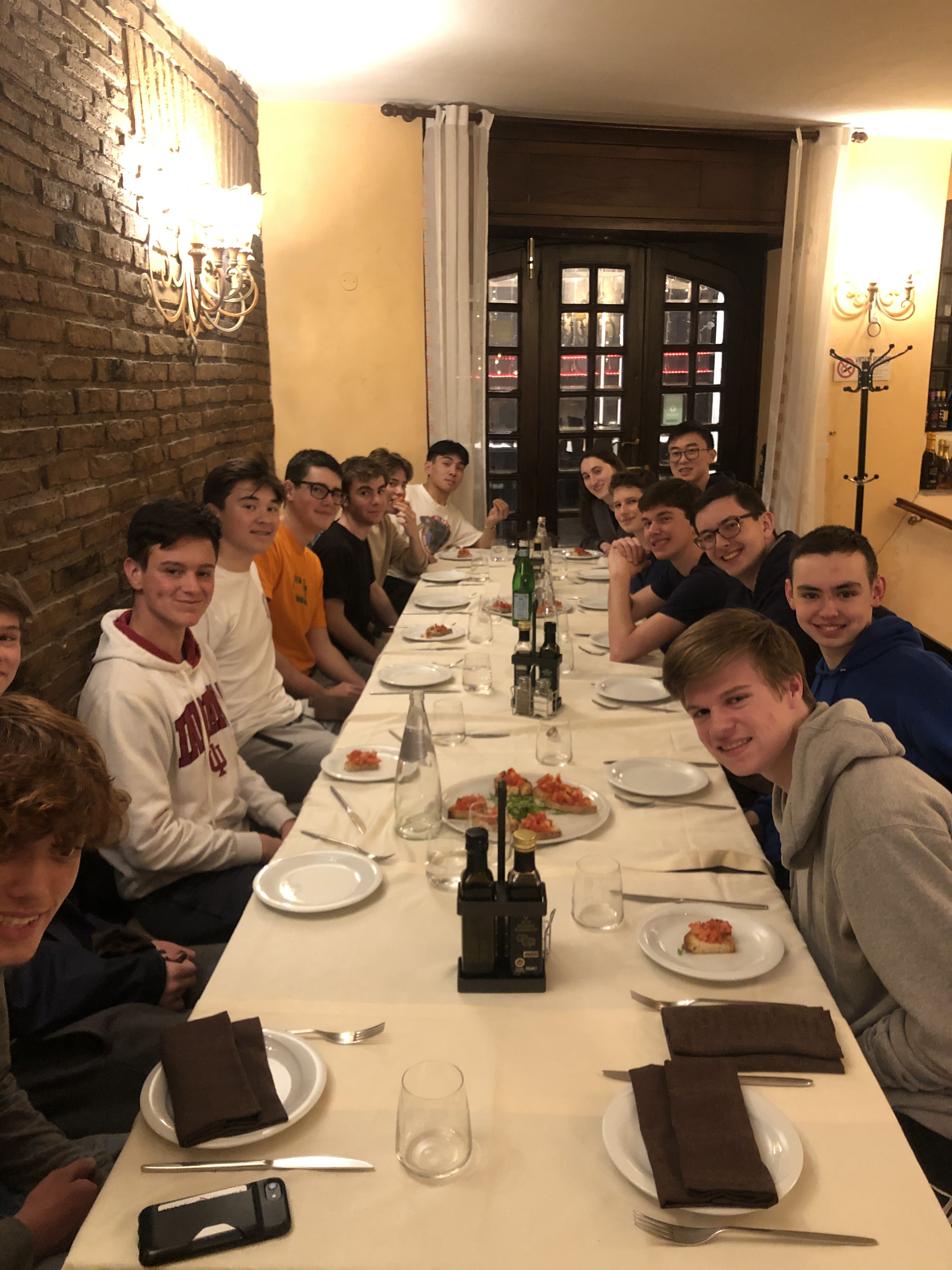 The group traveled from San Francisco to Zurich for a layover where we enjoyed some Swiss chocolate, then it was on to Rome! It was a long day of travel, but the students were still ready for an Italian dinner. We ate at Clavdia Ristorante Pizzeria italiana where the students enjoyed many dishes of antipasto and options from a large menu, including spaghetti carbonara, cacio e pepe, ravioli ripieno di spigola, linguine frutti di mare and more. The students are excited for an early morning tomorrow, starting with a tour of the Roman Forum and the Palatine Hill.