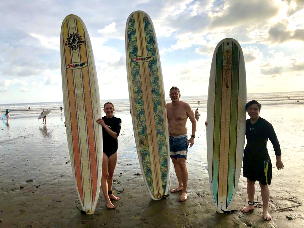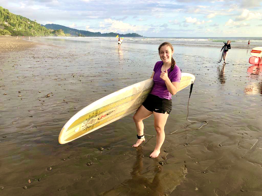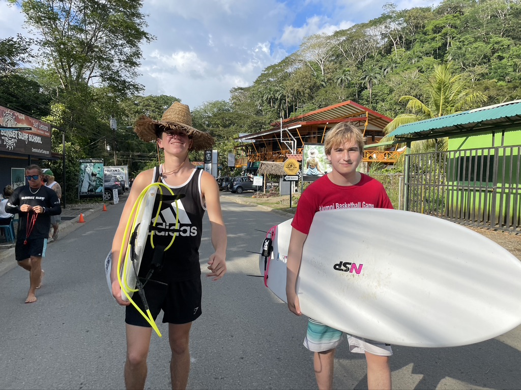 ¡Hola from Dominical! This morning my group, Tortuga, took the bus to a local school called La Escuela Balena. After playing soccer and drawing with the kids, we began to paint their school cafeteria and dug a new garden plot. Lunch was a delicious rice and meat dish with salad on the side. We drove back to the hotel and quickly got ready for surfing. After a short walk through town, we made it to the beach! Our surf instructors were super friendly and I was able to stand up after the first few tries. Surfing under the sunset was one of the most special experiences that I have had on this trip! I can’t wait for what tomorrow will bring! ¡Adios! ¡Pura Vida!