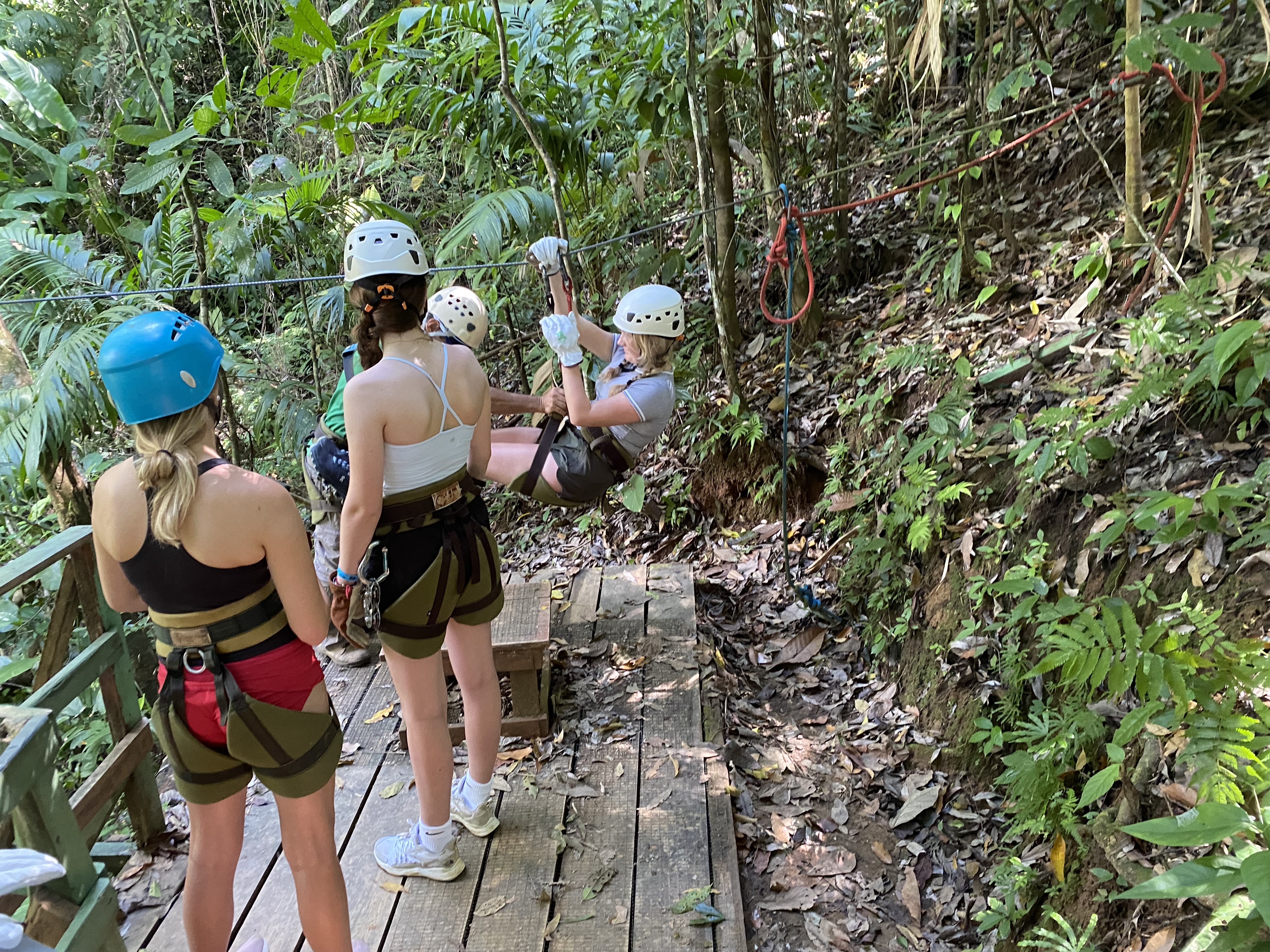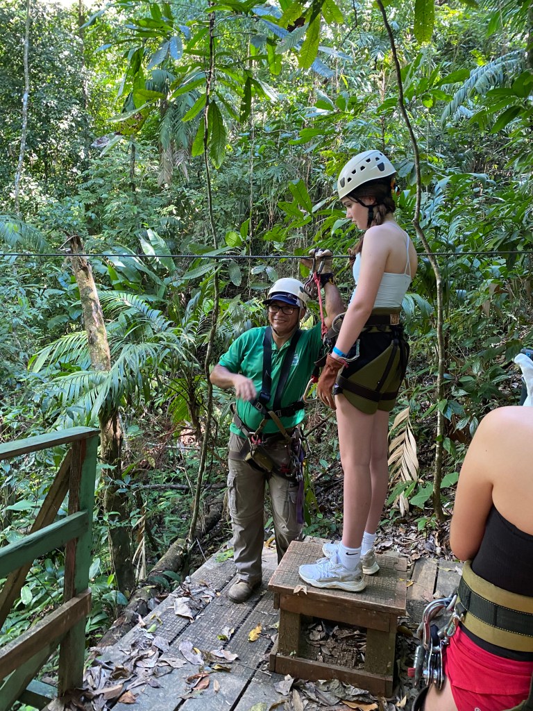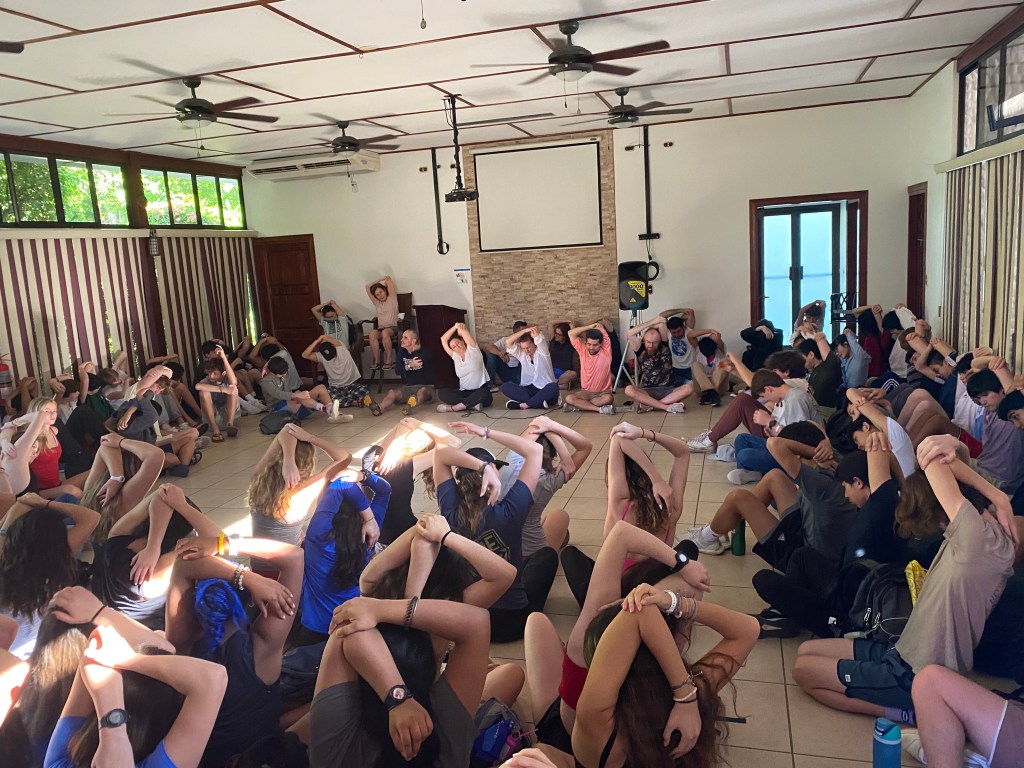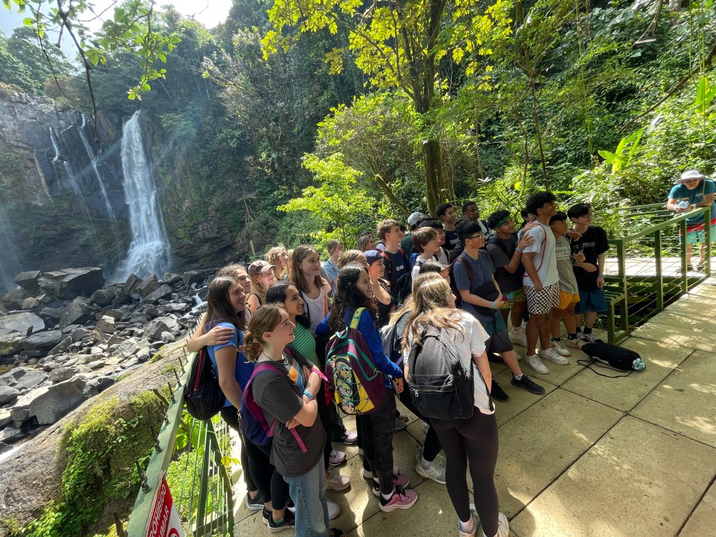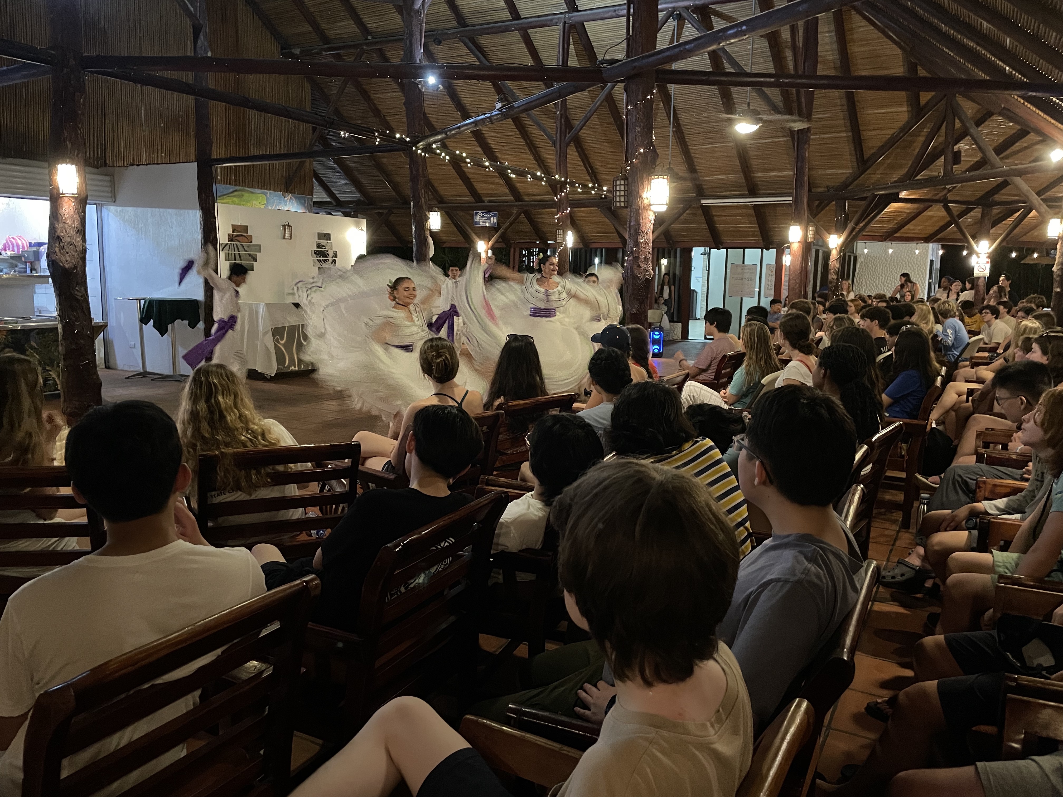 After an exciting first day in Costa Rica, we were ready for another day of adventures. The Stuart day group went to beautiful waterfalls by way of horseback riding. Each horse we were given had a unique personality, including Piojo and Gordojo, who loved to go fast. One particular horse named Tequila was notorious for its “loco” personality. Surrounded by gorgeous scenery and nature, jumping off the waterfall was both exhilarating and terrifying; it was an exciting experience for everyone. On the way back from the waterfalls, we were welcomed by the local community with a freshly made feast served with refreshing pineapple juice. We were surprised to see peacocks, macaw parrots, agouti and monkeys. When we arrived back at the hotel, the day groups went to their afternoon activities, including cooking, yoga and salsa dancing. To end the night, local dancers performed traditional dances, inviting students to try on their dresses and hats. This was a truly unforgettable day.