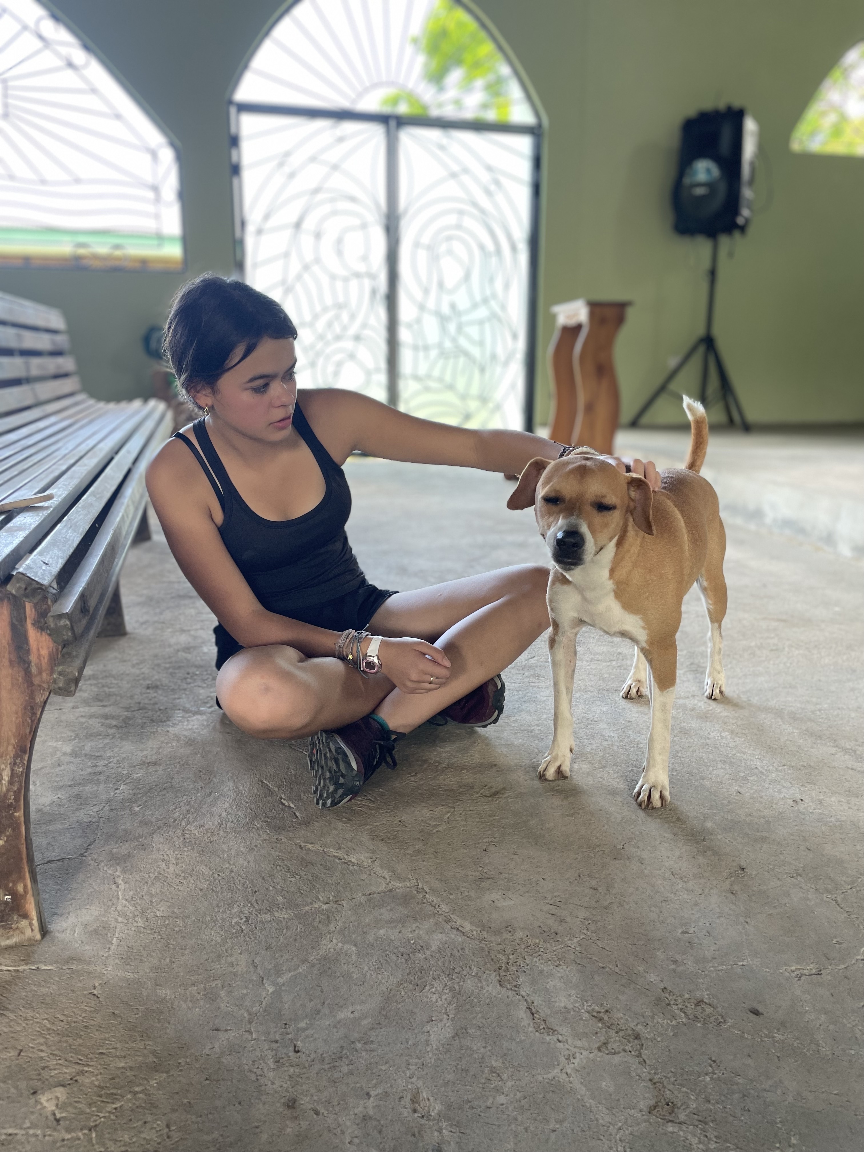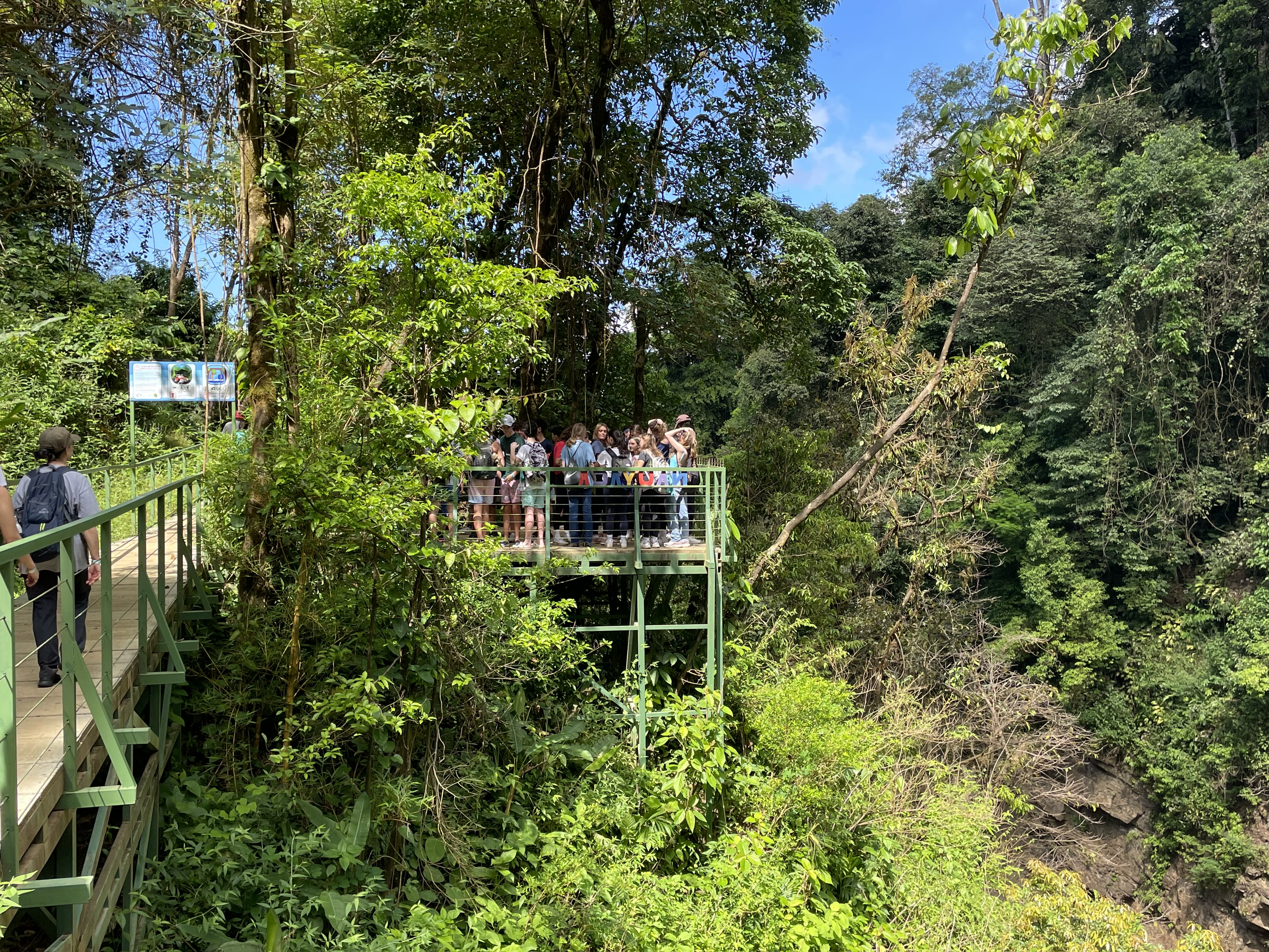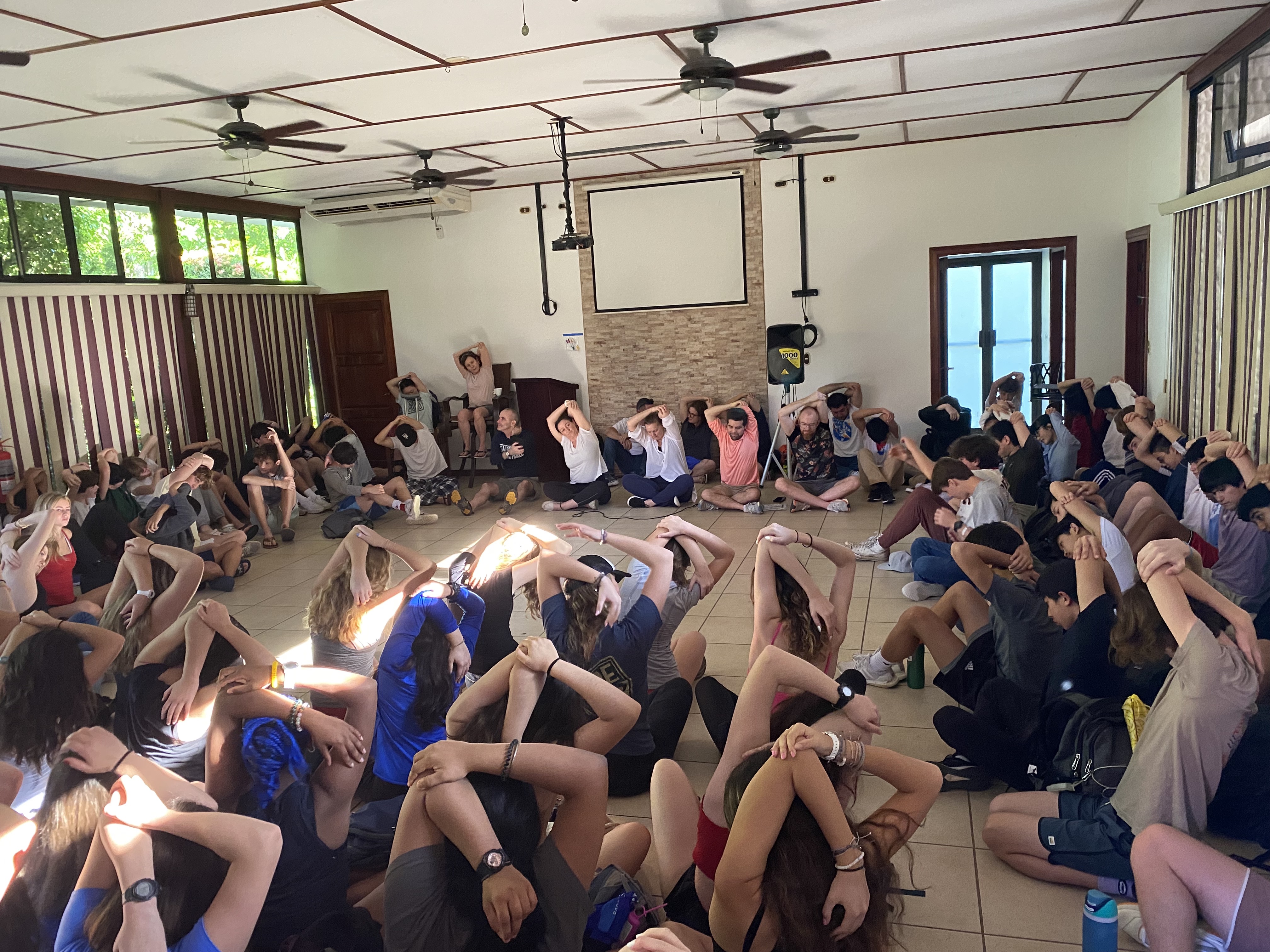 After an exciting first day in Costa Rica, we were ready for another day of adventures. The Stuart day group went to beautiful waterfalls by way of horseback riding. Each horse we were given had a unique personality, including Piojo and Gordojo, who loved to go fast. One particular horse named Tequila was notorious for its “loco” personality. Surrounded by gorgeous scenery and nature, jumping off the waterfall was both exhilarating and terrifying; it was an exciting experience for everyone. On the way back from the waterfalls, we were welcomed by the local community with a freshly made feast served with refreshing pineapple juice. We were surprised to see peacocks, macaw parrots, agouti and monkeys. When we arrived back at the hotel, the day groups went to their afternoon activities, including cooking, yoga and salsa dancing. To end the night, local dancers performed traditional dances, inviting students to try on their dresses and hats. This was a truly unforgettable day.