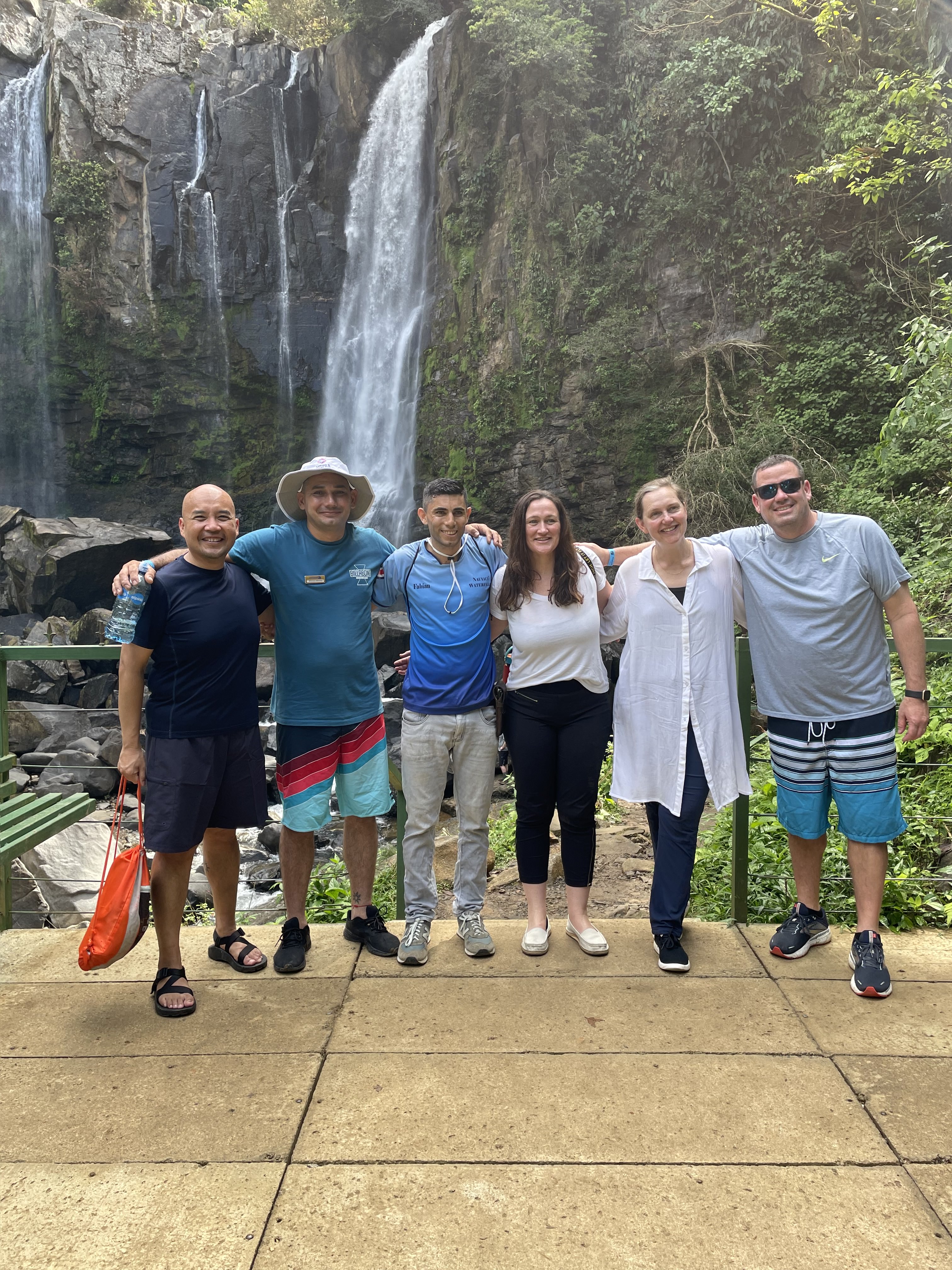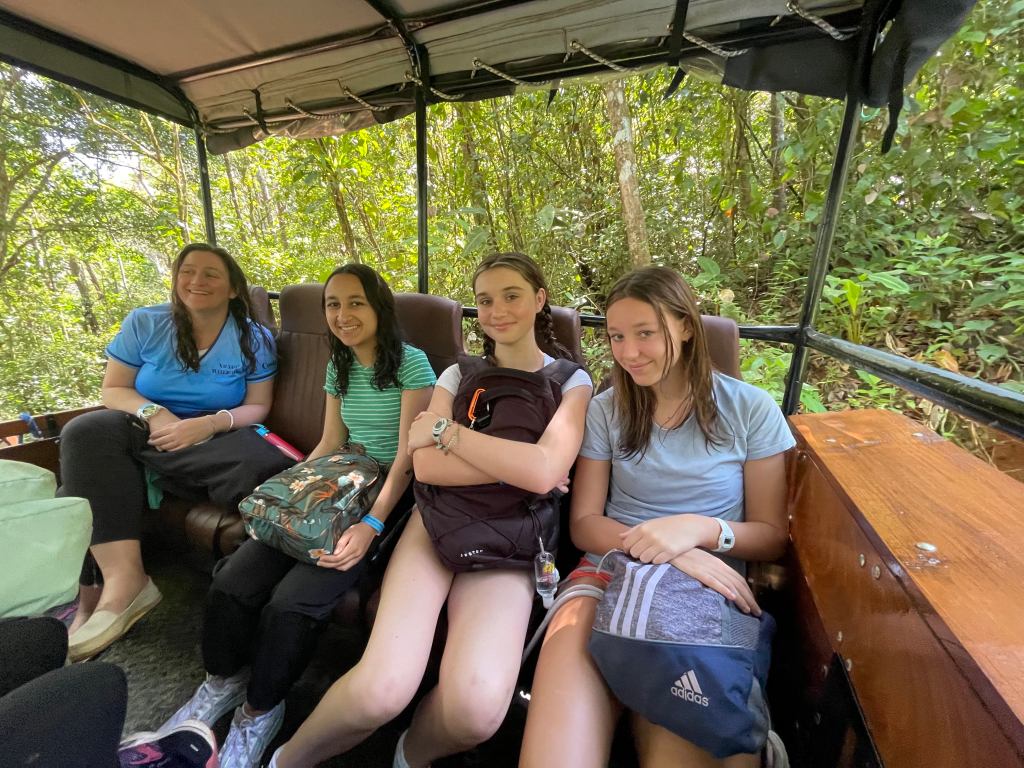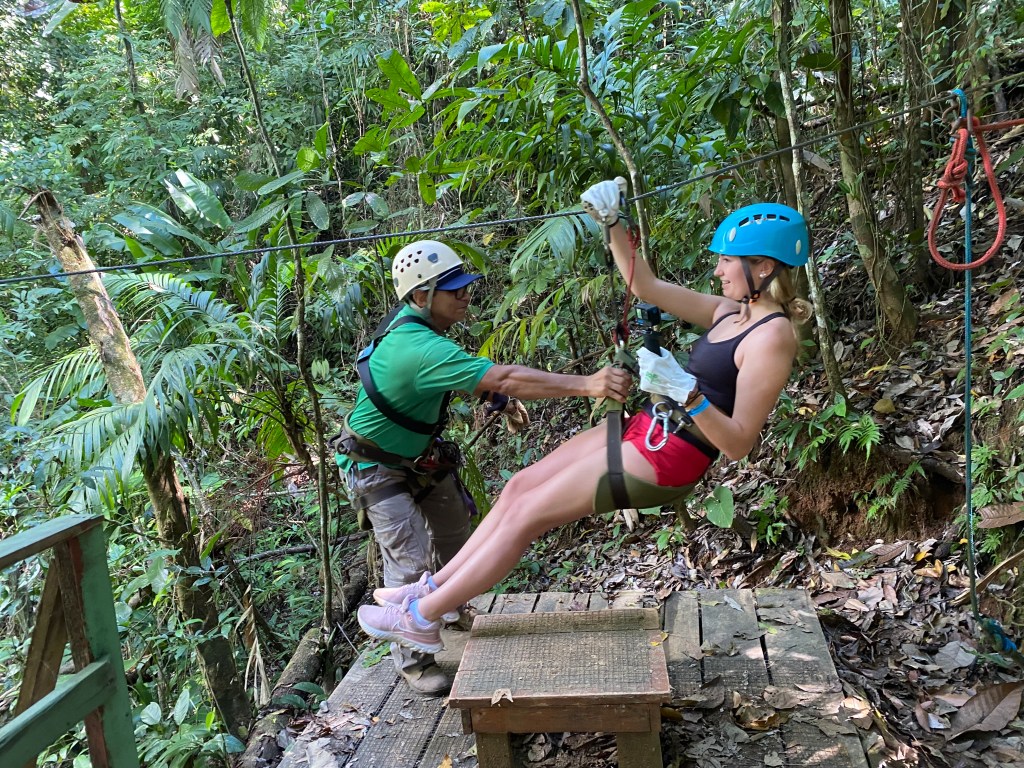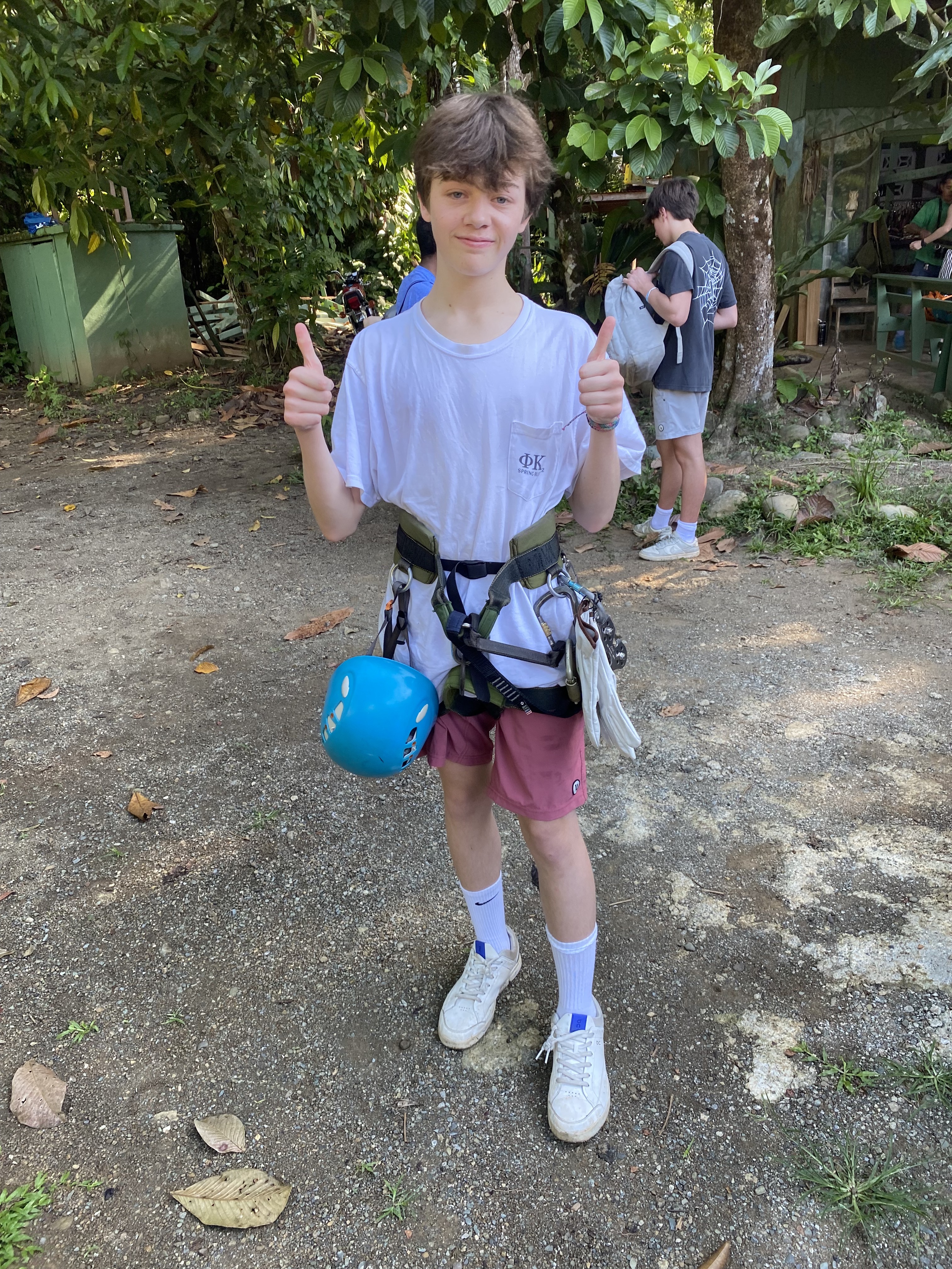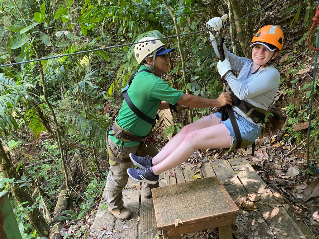 After an exciting first day in Costa Rica, we were ready for another day of adventures. The Stuart day group went to beautiful waterfalls by way of horseback riding. Each horse we were given had a unique personality, including Piojo and Gordojo, who loved to go fast. One particular horse named Tequila was notorious for its “loco” personality. Surrounded by gorgeous scenery and nature, jumping off the waterfall was both exhilarating and terrifying; it was an exciting experience for everyone. On the way back from the waterfalls, we were welcomed by the local community with a freshly made feast served with refreshing pineapple juice. We were surprised to see peacocks, macaw parrots, agouti and monkeys. When we arrived back at the hotel, the day groups went to their afternoon activities, including cooking, yoga and salsa dancing. To end the night, local dancers performed traditional dances, inviting students to try on their dresses and hats. This was a truly unforgettable day.