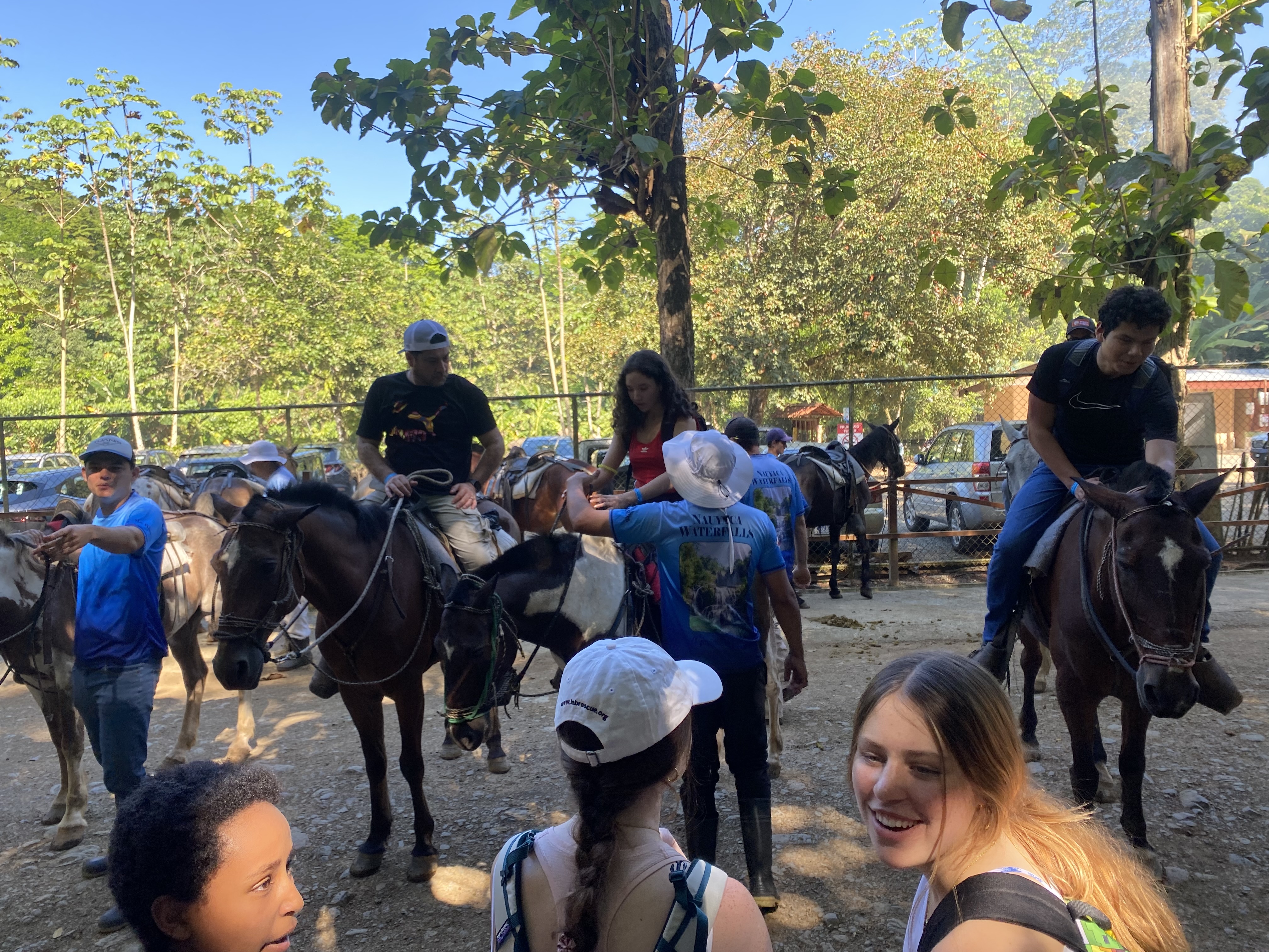The day started abruptly with a pounding at the door at 6:45, but with a delightful bacon and eggs breakfast. First thing on the agenda was a group meeting with all of the students and chaperones. Next, we climbed onto a green bus heading to horseback riding and waterfalls! After the short ride, we stepped into three pickup trucks with 10 open-air seats. We then descended down to the ranch where the horses were saddled waiting for us. There, we split into two groups (~19 in each); one group would go back into trucks and the other group mounted onto the horses. This was my (Ryker Fringer – Student) first time ever riding a horse! The two groups then met at the waterfall where they changed into their bathing suits and hiked down to the plunge pool. There was an amazing view! The plunge pool turned into a river, which was completely surrounded by boulders and rocks. To be able to jump off the waterfall (~30 ft), one…
