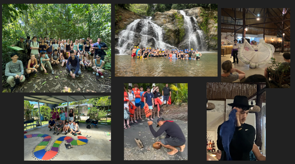 The day started abruptly with a pounding at the door at 6:45, but with a delightful bacon and eggs breakfast. First thing on the agenda was a group meeting with all of the students and chaperones. Next, we climbed onto a green bus heading to horseback riding and waterfalls! After the short ride, we stepped into three pickup trucks with 10 open-air seats. We then descended down to the ranch where the horses were saddled waiting for us. There, we split into two groups (~19 in each); one group would go back into trucks and the other group mounted onto the horses. This was my (Ryker Fringer – Student) first time ever riding a horse! The two groups then met at the waterfall where they changed into their bathing suits and hiked down to the plunge pool. There was an amazing view! The plunge pool turned into a river, which was completely surrounded by boulders and rocks. To be able to jump off the waterfall (~30 ft), one…