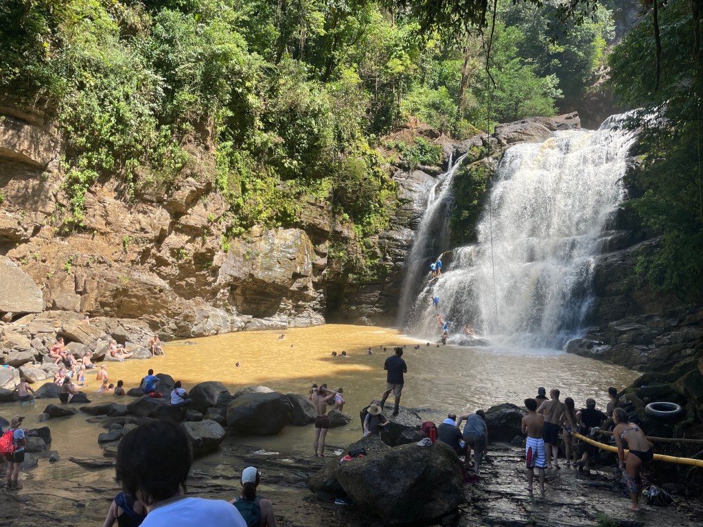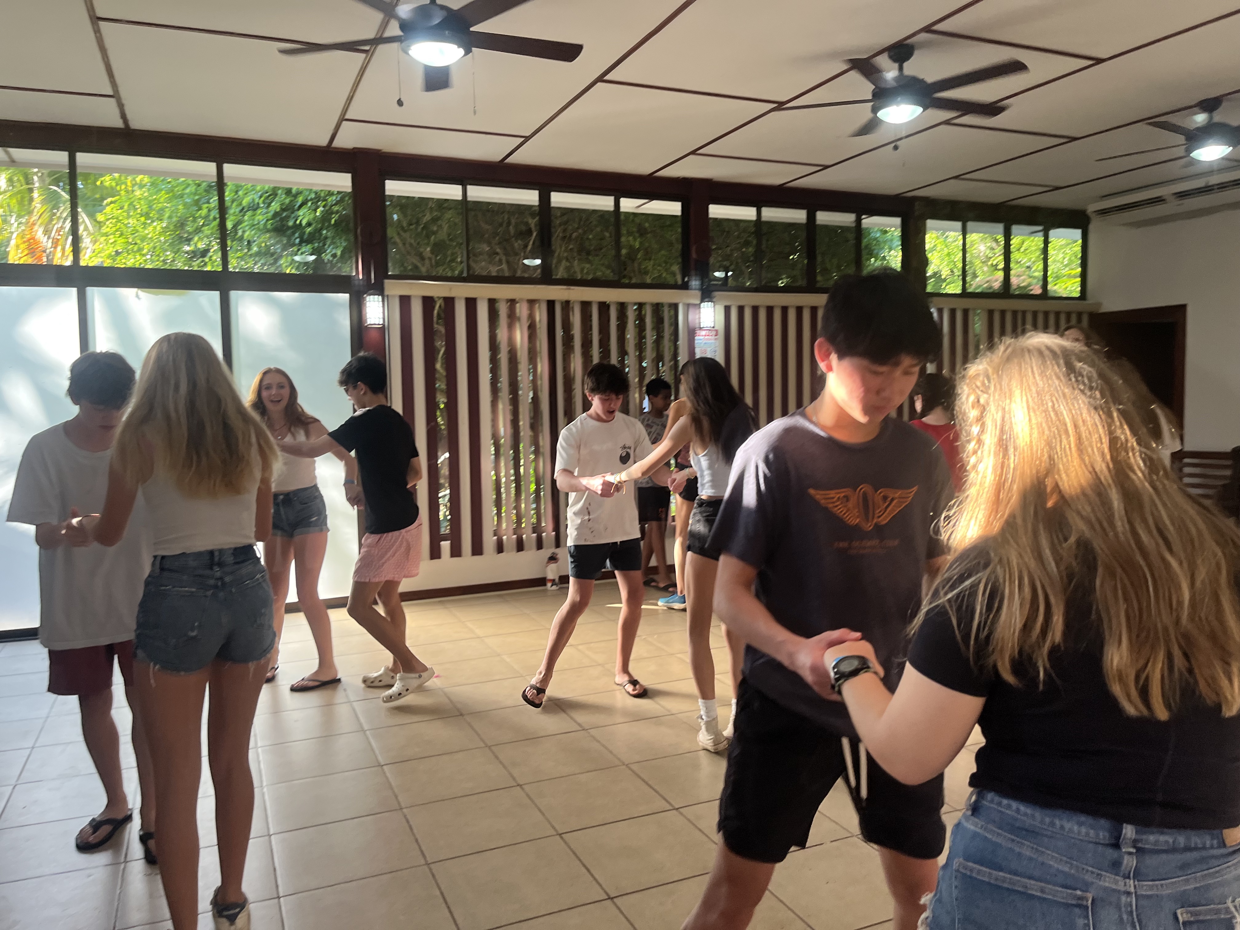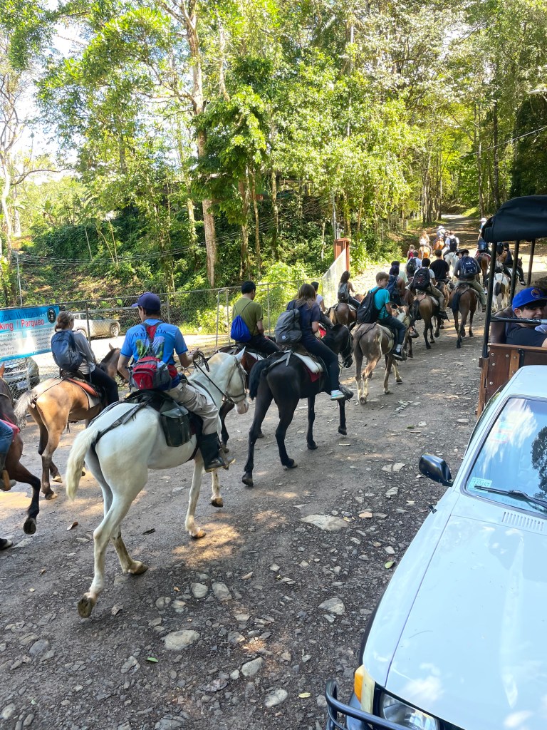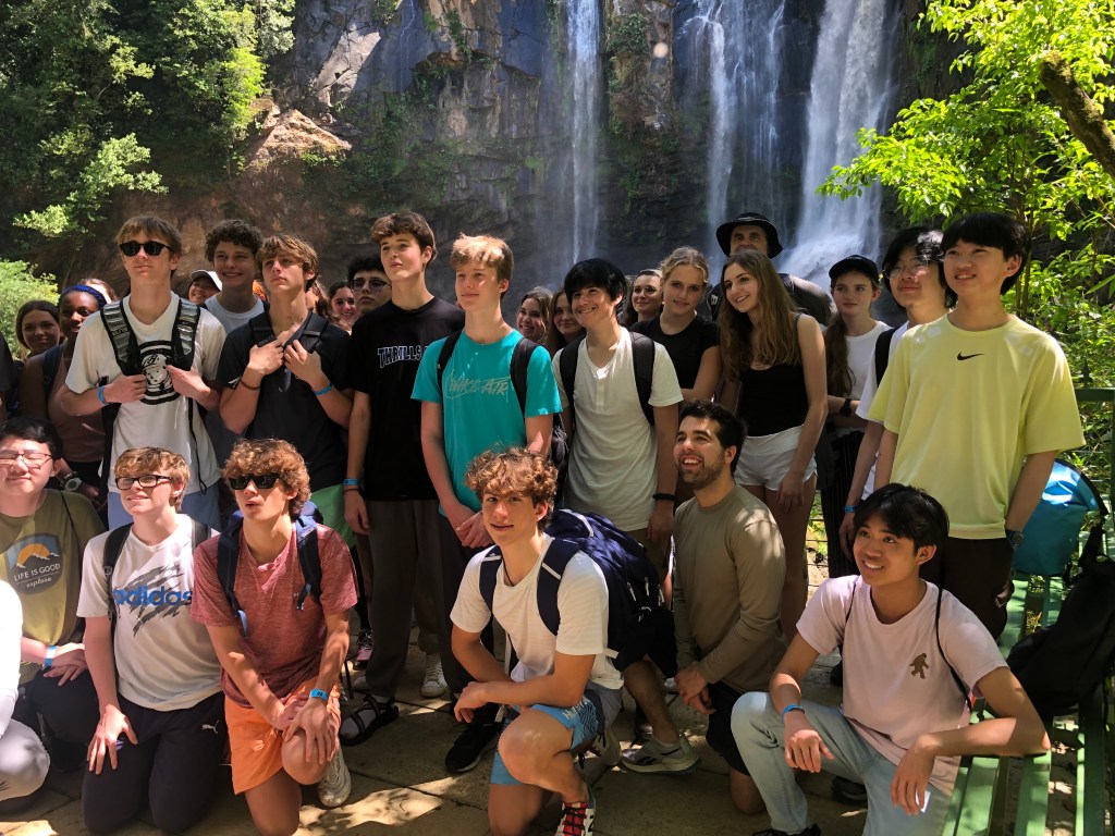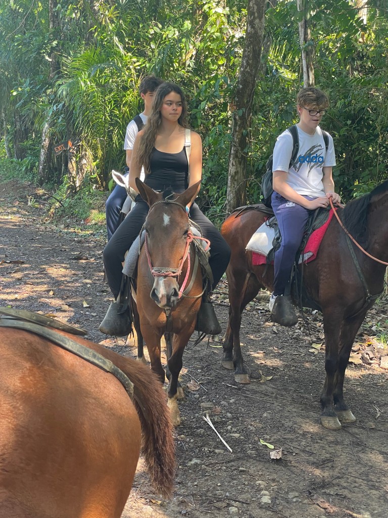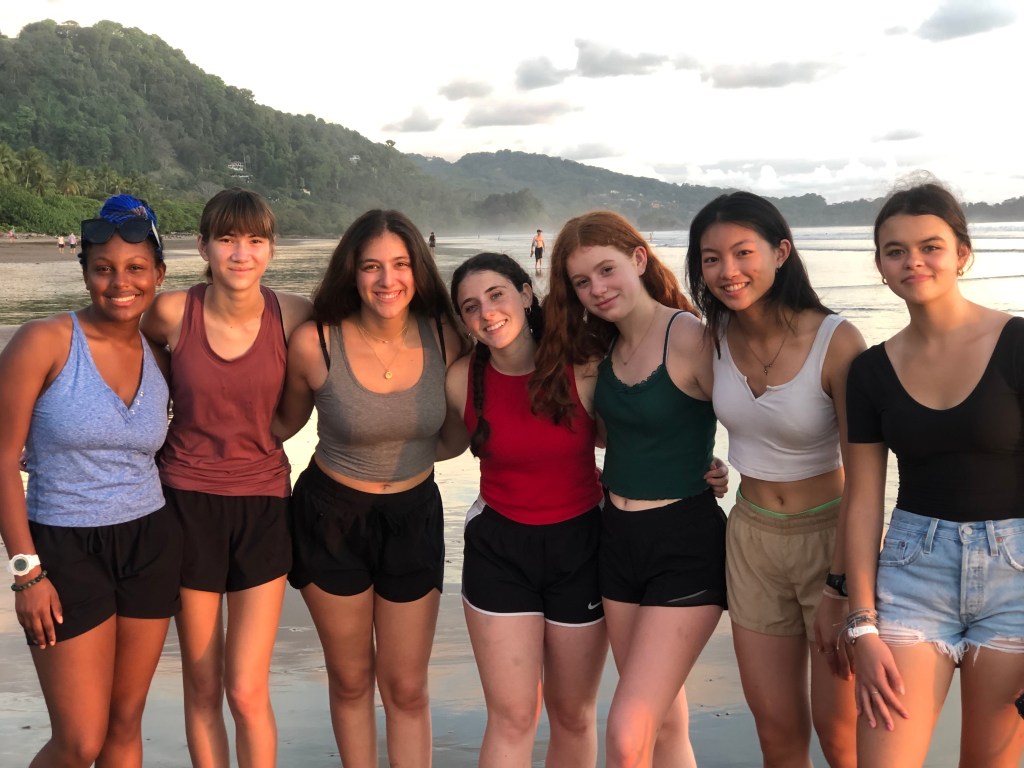 After an exciting first day in Costa Rica, we were ready for another day of adventures. The Stuart day group went to beautiful waterfalls by way of horseback riding. Each horse we were given had a unique personality, including Piojo and Gordojo, who loved to go fast. One particular horse named Tequila was notorious for its “loco” personality. Surrounded by gorgeous scenery and nature, jumping off the waterfall was both exhilarating and terrifying; it was an exciting experience for everyone. On the way back from the waterfalls, we were welcomed by the local community with a freshly made feast served with refreshing pineapple juice. We were surprised to see peacocks, macaw parrots, agouti and monkeys. When we arrived back at the hotel, the day groups went to their afternoon activities, including cooking, yoga and salsa dancing. To end the night, local dancers performed traditional dances, inviting students to try on their dresses and hats. This was a truly unforgettable day.
