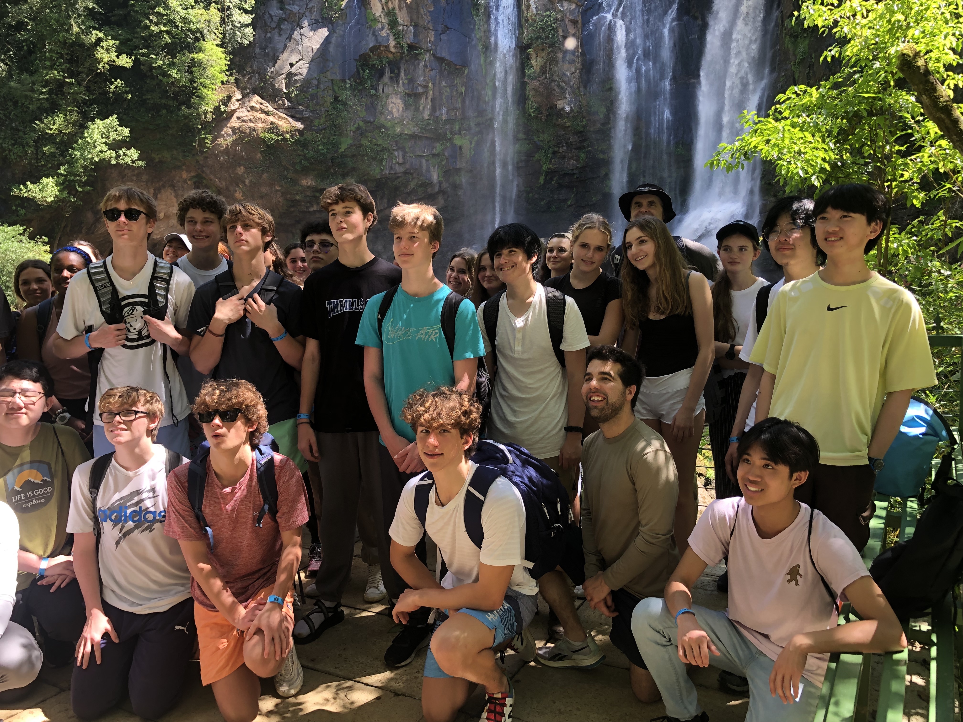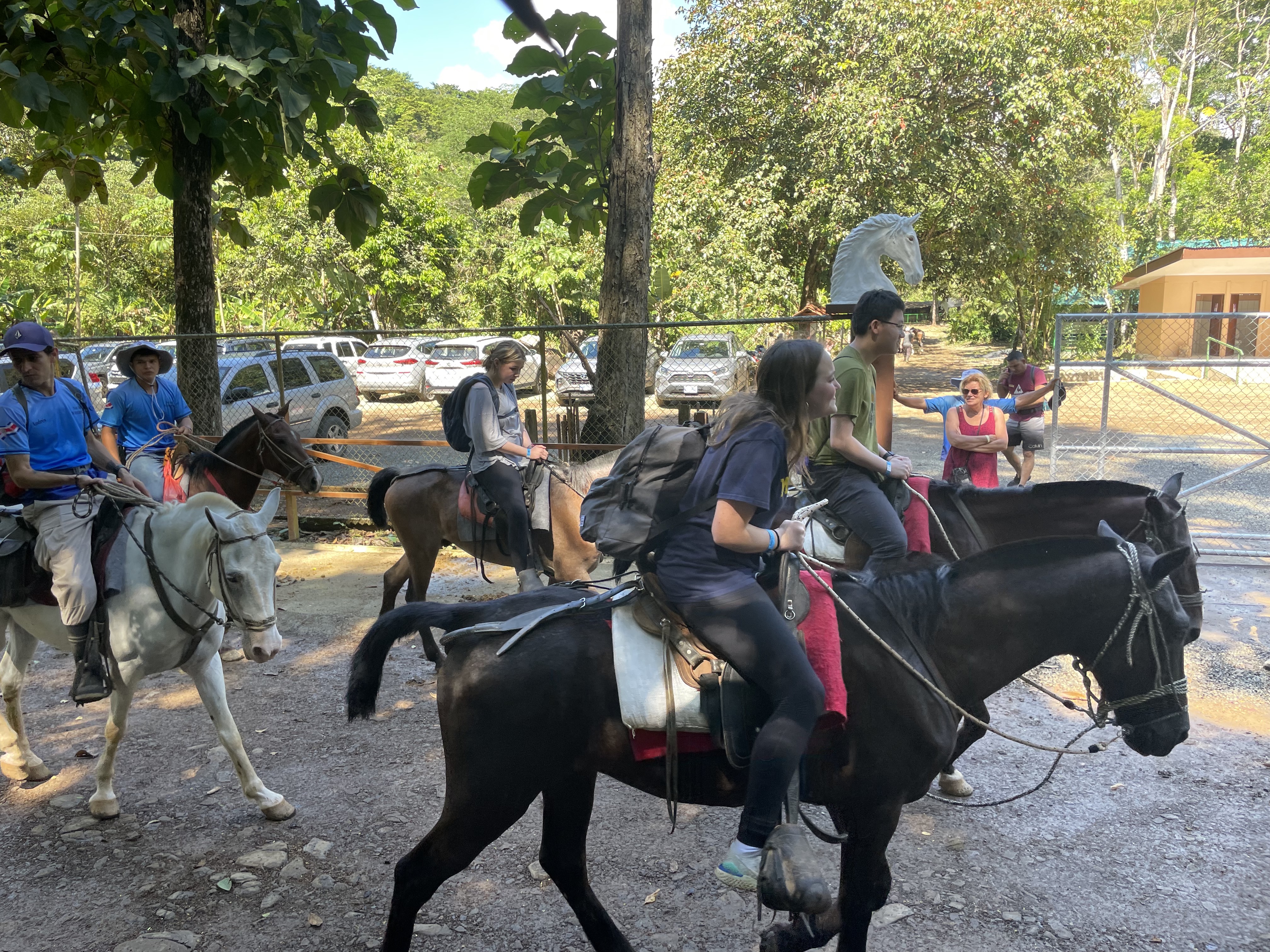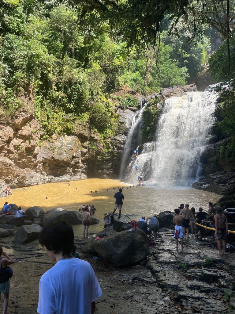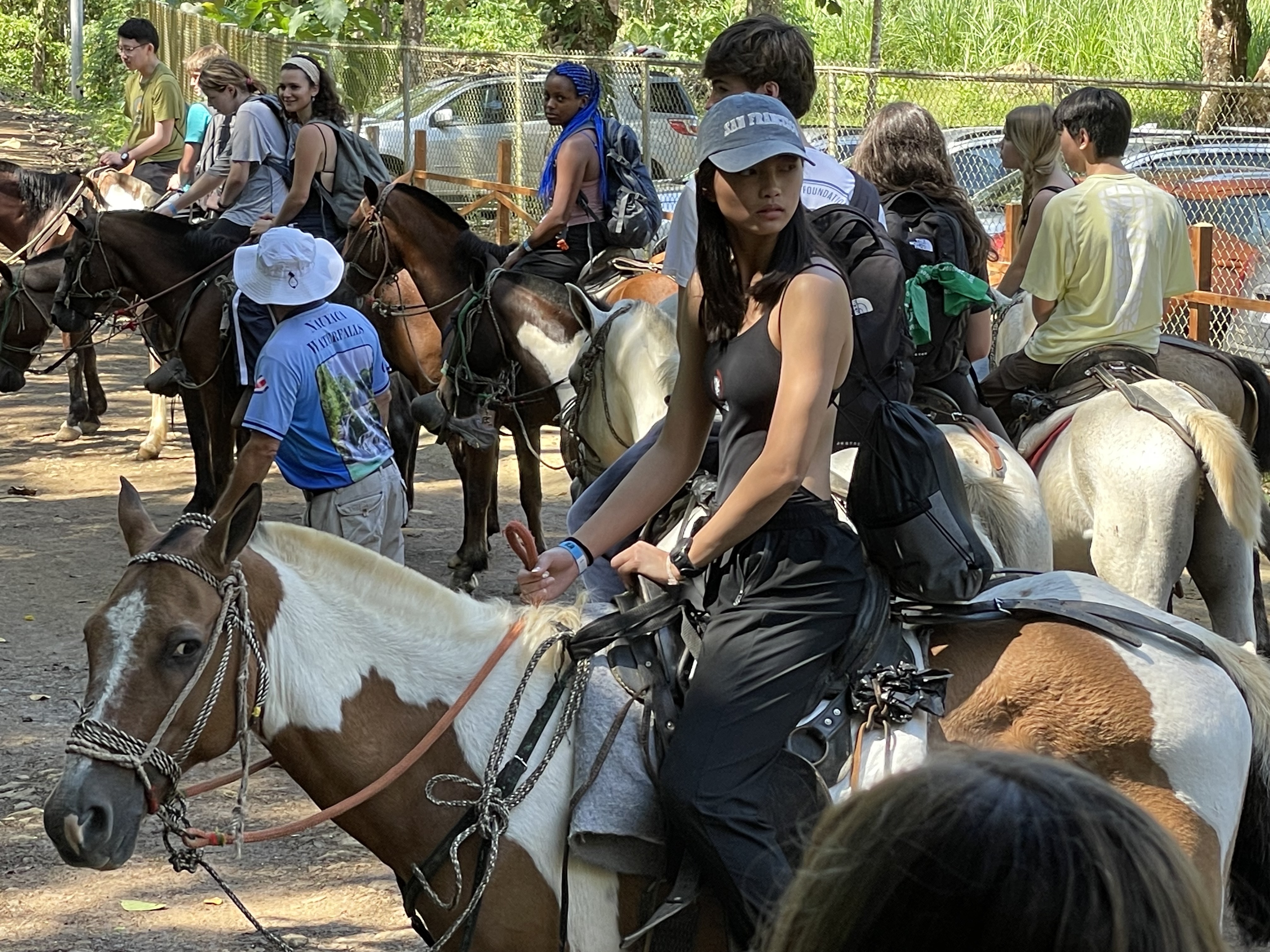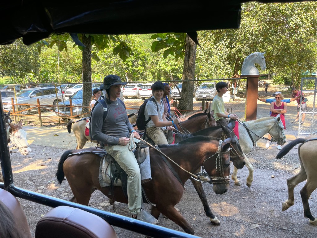 After an exciting first day in Costa Rica, we were ready for another day of adventures. The Stuart day group went to beautiful waterfalls by way of horseback riding. Each horse we were given had a unique personality, including Piojo and Gordojo, who loved to go fast. One particular horse named Tequila was notorious for its “loco” personality. Surrounded by gorgeous scenery and nature, jumping off the waterfall was both exhilarating and terrifying; it was an exciting experience for everyone. On the way back from the waterfalls, we were welcomed by the local community with a freshly made feast served with refreshing pineapple juice. We were surprised to see peacocks, macaw parrots, agouti and monkeys. When we arrived back at the hotel, the day groups went to their afternoon activities, including cooking, yoga and salsa dancing. To end the night, local dancers performed traditional dances, inviting students to try on their dresses and hats. This was a truly unforgettable day.